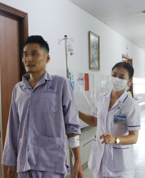 Bệnh nhân đi lại nhẹ nhàng trong hành lang bệnh viện, vì còn khó thở nên bệnh nhân được "đặc cách" không đeo khẩu trang. Ảnh Thư Anh.