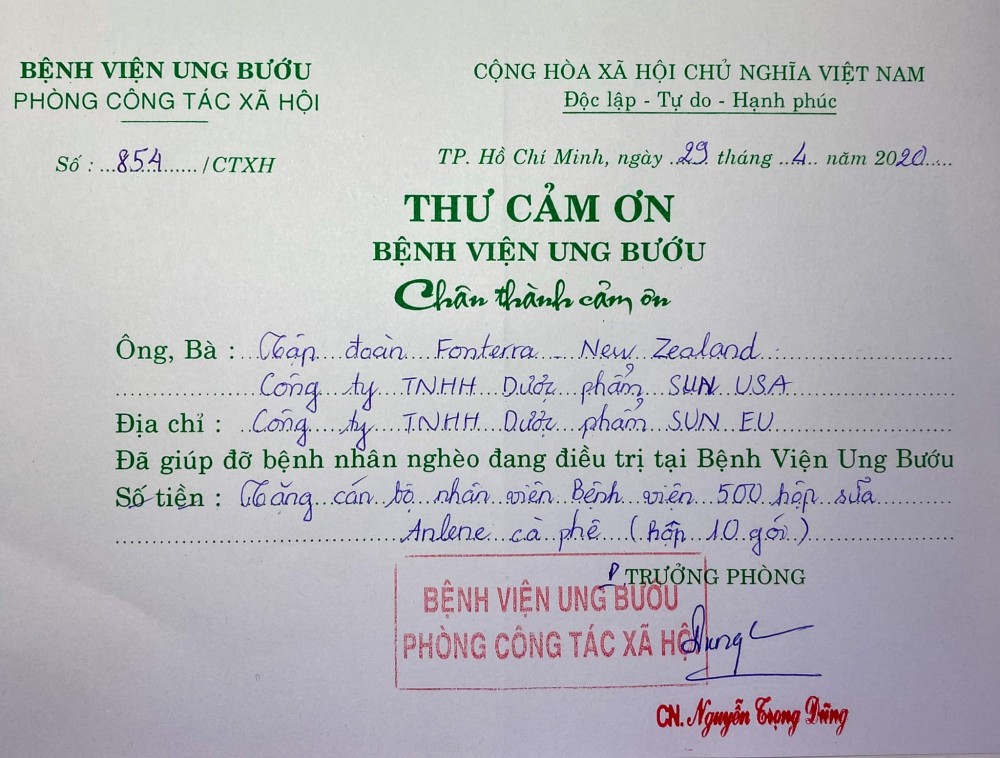 Thư cảm ơn từ Bệnh Viện