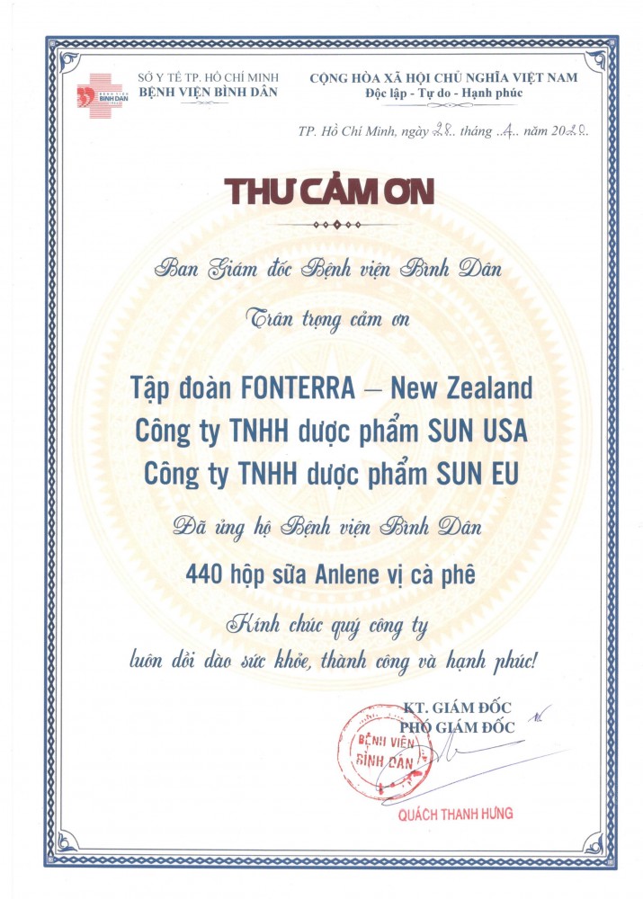 Thay mặt cho Tập đoàn Fonterra New Zealand – Công ty TNHH Dược Phẩm Sun USA và Công ty TNHH Dược Phẩm Sun EU gửi đến Quý Bệnh viện lời chào trân trọng sức khoẻ và thành công. Hiện tại, Tập đoàn Fonterra – New Zealand kết hợp với Medical Group: Công ty TNHH Dược Phẩm Sun USA và Công ty TNHH Dược Phẩm Sun EU là nhà phân phối độc quyền nhóm hàng sữa Anlene tại thị trường Việt Nam.