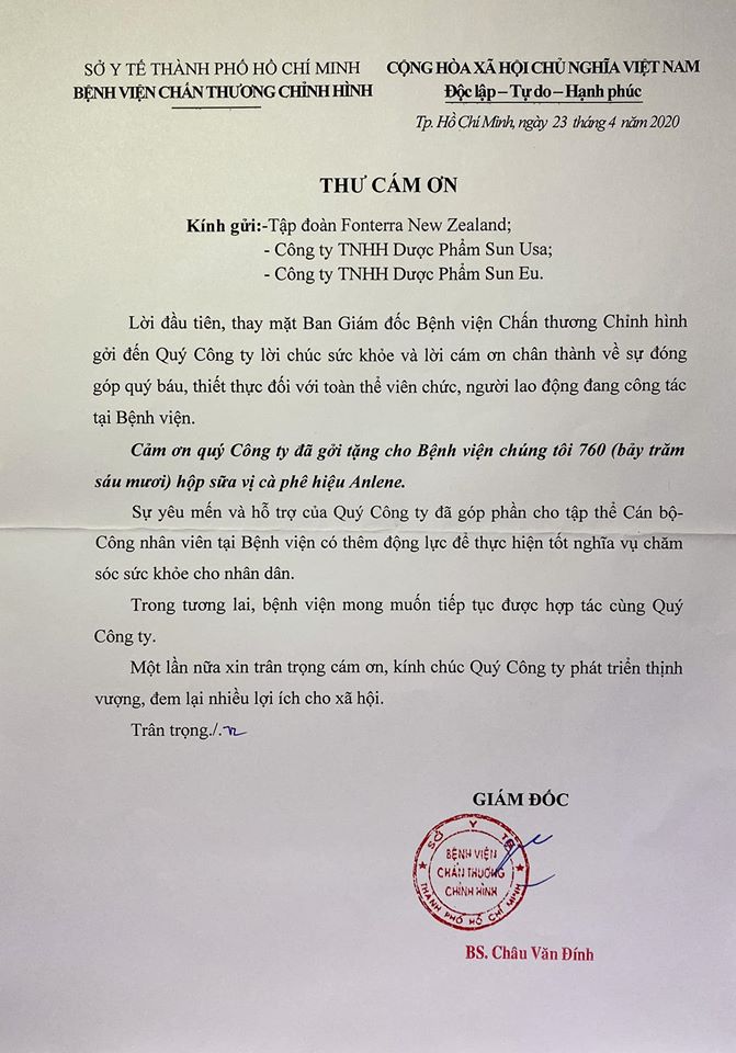 Thay mặt cho Tập đoàn Fonterra New Zealand – Công ty TNHH Dược Phẩm Sun USA và Công ty TNHH Dược Phẩm Sun EU gửi đến Quý Bệnh viện lời chào trân trọng sức khoẻ và thành công. Hiện tại, Tập đoàn Fonterra – New Zealand kết hợp với Medical Group: Công ty TNHH Dược Phẩm Sun USA và Công ty TNHH Dược Phẩm Sun EU là nhà phân phối độc quyền nhóm hàng sữa Anlene tại thị trường Việt Nam.