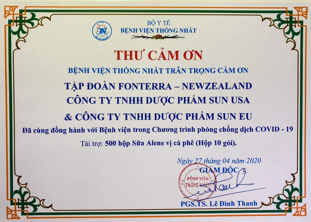 Thay mặt cho Tập đoàn Fonterra New Zealand – Công ty TNHH Dược Phẩm Sun USA và Công ty TNHH Dược Phẩm Sun EU gửi đến Quý Bệnh viện lời chào trân trọng sức khoẻ và thành công. Hiện tại, Tập đoàn Fonterra – New Zealand kết hợp với Medical Group: Công ty TNHH Dược Phẩm Sun USA và Công ty TNHH Dược Phẩm Sun EU là nhà phân phối độc quyền nhóm hàng sữa Anlene tại thị trường Việt Nam.